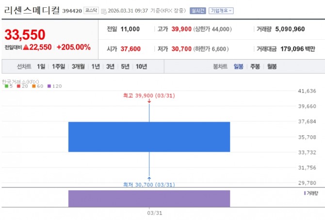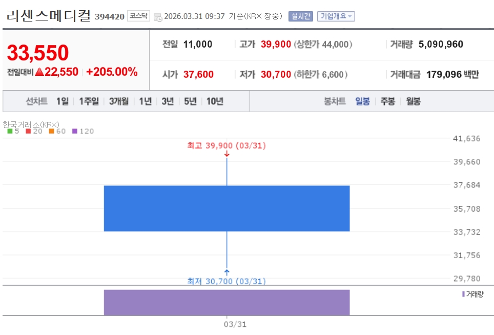 이미지 확대보기31일 한국거래소에 따르면 오전 9시37분 이 회사는 공모가(1만1000원) 대비 205.00% 오른 3만3550원에 거래 중이다. 장중 3만9900원까지 오르기도 했다.