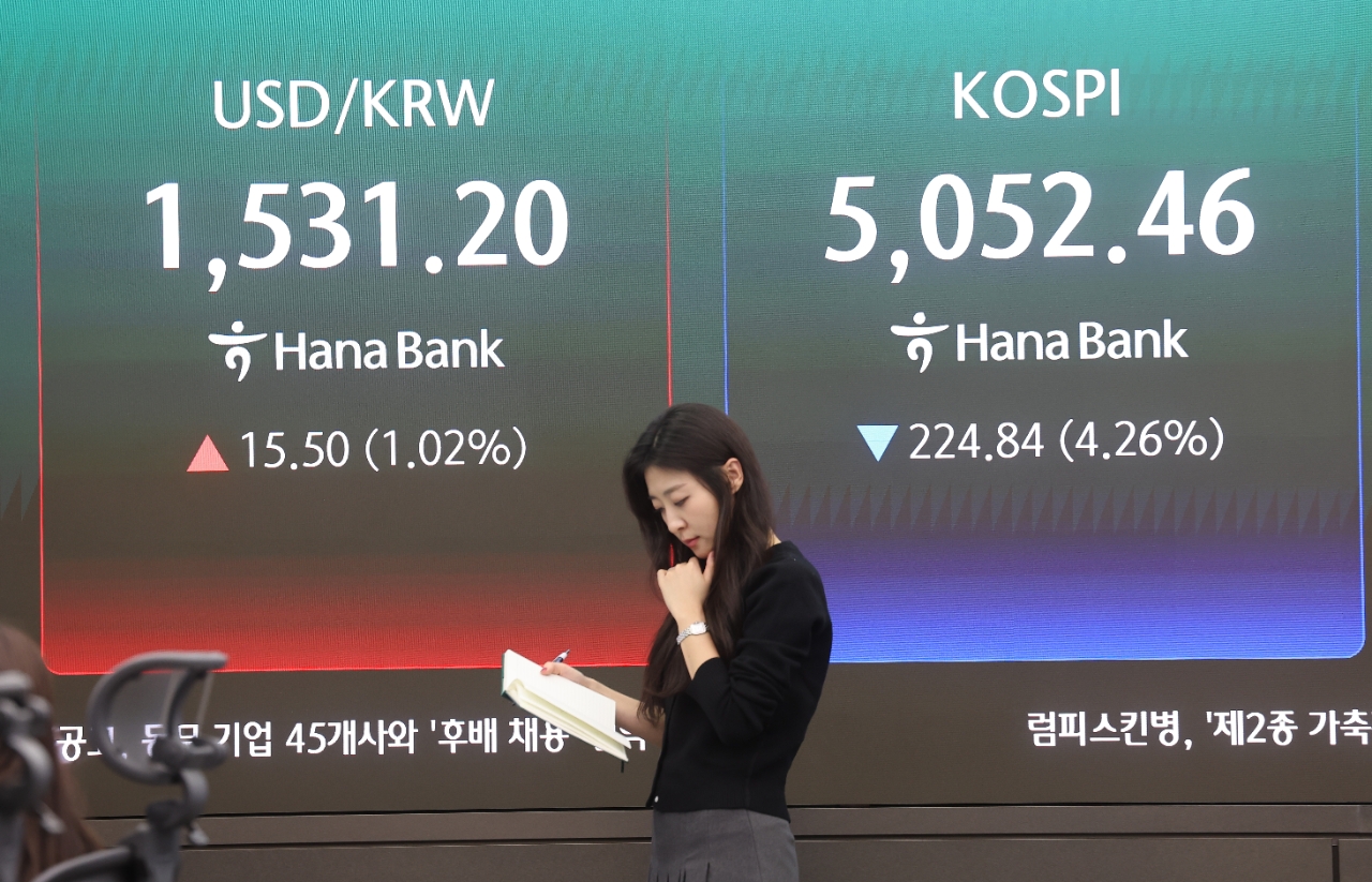 코스닥 지수는 전 거래일보다 4.94%( 54.66포인트) 하락한 1052.39로 마감했다.