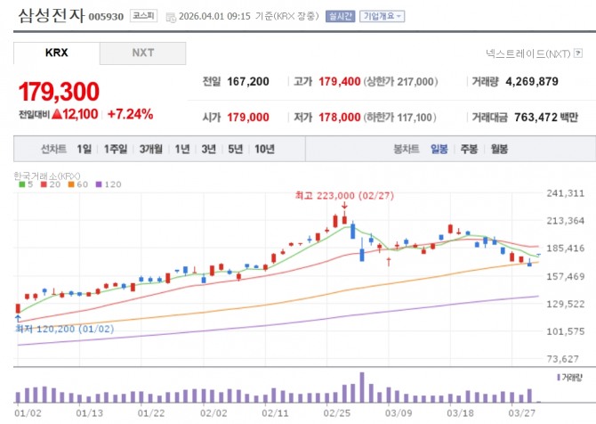 이미지 확대보기1일 한국거래소에 따르면 오전 9시15분 삼성전자는 전 거래일 대비 7.24% 오른 17만9300원, SK하이닉스는 7.31% 오른 86만6000원에 거래 중이다.
