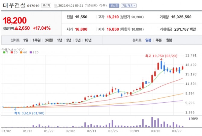 이미지 확대보기1일 한국거래소에 따르면 이날 오전 9시 21분 현재 대우건설은 전거래일 대비 17.04% 오른 1만8200원에, GS건설은 9.96% 오른 2만7600원에 거래되고 있다. DL이앤씨(+8.98%), 현대건설(+8.66%), HDC현대산업개발(+4.65%), 삼성물산(+4.54%) 등 대표 건설주들이 일제히 강세다.