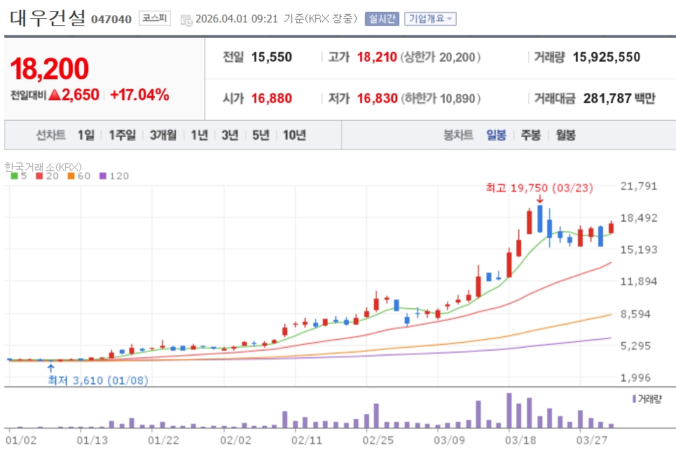 이미지 확대보기마수드 페제시키안 이란 대통령이 EU 이사회 의장과의 통화에서 “전쟁을 끝낼 의지가 있다”고 밝혔고, 트럼프 미국 대통령도 “2주, 어쩌면 몇 주 안에 작전을 끝낼 수 있다”고 언급했다. 이에 간밤 뉴욕증시에서 스탠다드앤푸어스500지수는 2.91%, 나스닥 종합지수는 3.83% 급등하며 2월 개전 이후 최대 반등을 기록했다. 국제유가는 여전히 높은 수준을 유지하고 있지만, 종전 시 이란·중동 재건 수주 기대감이 건설주에 선반영되는 모습이다.