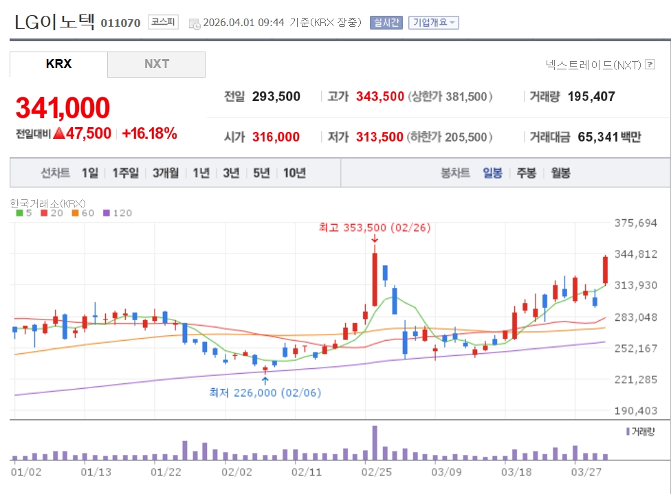 이미지 확대보기1일 한국거래소에 따르면 오전 9시44분 현재 LG이노텍은 전일 대비 16.18% 오른 34만1000원에 거래되고 있다.