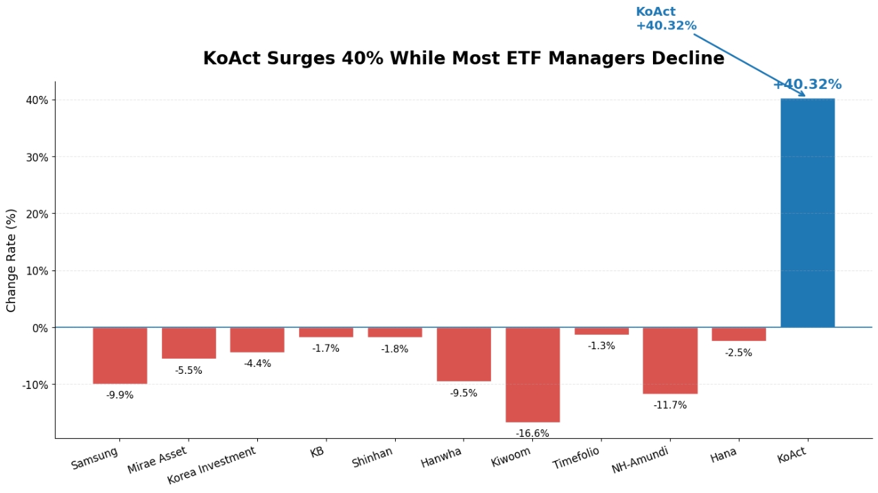 이번 3월 데이터에서 가장 놀라운 수치는 삼성액티브자산운용(KoAct)에서 나왔다. 시장 전체가 7% 하락할 때 삼성액티브는 순자산을 무려 40.32%나 늘렸다.