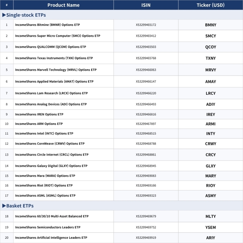 인컴셰어즈 ETP는 주간 옵션 전략을 활용해 개별 주식, 원자재, 지수에 대한 익스포저를 유지하면서 매월 분배금을 지급하는 구조로 설계됐다.