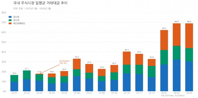 이미지 확대보기1일 글로벌이코노믹이 한국거래소와 넥스트레이드 거래대금을 집계한 결과 2026년 3월 유가증권시장(코스피)과 코스닥, 넥스트레이드를 합산한 일평균 거래대금은 68.89조 원을 기록했다. 이는 역대 최고치였던 지난 2월의 68.94조 원보다 약 500억 원가량 줄어든 수치다.