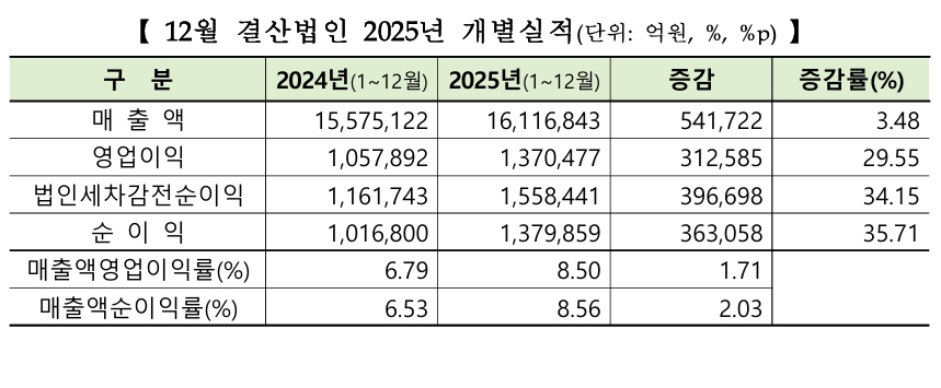 연결 재무제표 기준 분석 대상 626개사의 2025년 매출액은 3082조 7609억 원으로 전년 대비 6.08% 증가했다. 특히 내실 면에서 큰 성과를 거뒀는데, 영업이익(244.8조 원)은 25.39%, 순이익(189.4조 원)은 33.57%나 수직 상승했다. 이에 따라 매출액 영업이익률(7.94%)과 순이익률(6.14%)도 전년 대비 각각 1.22%, 1.26% 개선되며 전반적인 수익성이 좋아진 모습이다.