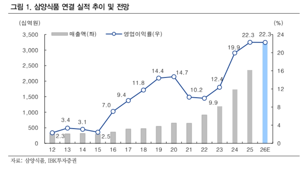 IBK투자증권이 3일 삼양식품에 대해 견조한 수요와 수출 성장세를 고려할 때 실적 방향성은 여전히 긍정적이라고 판단했다. 이에 투자의견 ‘매수’, 목표주가 167만원을 유지했다.