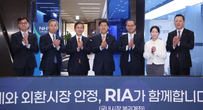 구윤철 경제부총리 겸 재정경제부 장관이 지난 3일 오후 국내시장 복귀계좌(RIA) 출시를 기념해 서울 영등포구 NH투자증권 본사를 방문, 기념촬영 하고 있다. 왼쪽부터 NH투자증권 강민훈 디지털사업부 대표, 윤병운 대표이사 사장, 황성엽 금융투자협회장, 구 부총리, 이찬우 NH농협금융지주회장, NH투자증권 채널솔루션부문 이재경 부사장, WM사업부 배광수 대표. 사진=뉴시스