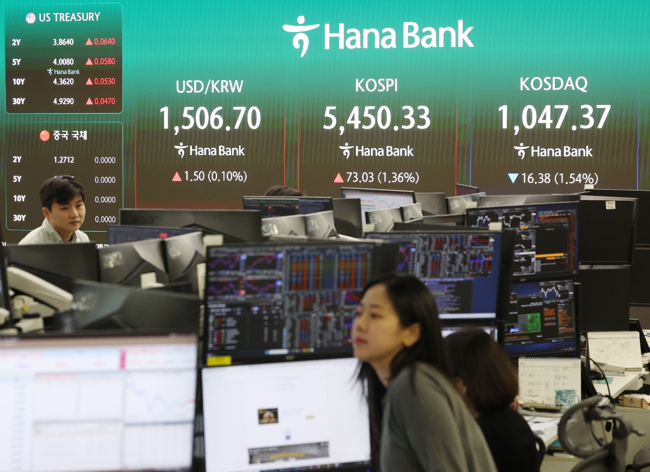 4월 6일 코스피 지수는 73.03포인트(1.36%) 오른 5450.33으로, 코스닥 지수는 16.38포인트(1.54%) 내린 1047.37로 장을 끝냈다. 사진=연합뉴스