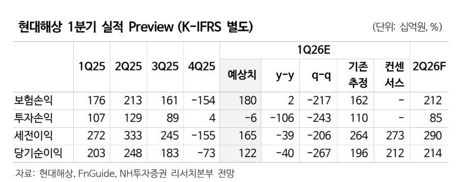 정 연구원은 “현대해상은 금리 상승에 따라 K-ICS비율이 2025년 말 190%에서 2026년 3월 말 약 200%로 상승할 전망”이라며 “물론 금리 상승으로 채권 평가손실도 예상되나, 시장의 주 우려 요인이 자본비율이었던 만큼 실보다는 득이 많다고 판단한다”고 짚었다.