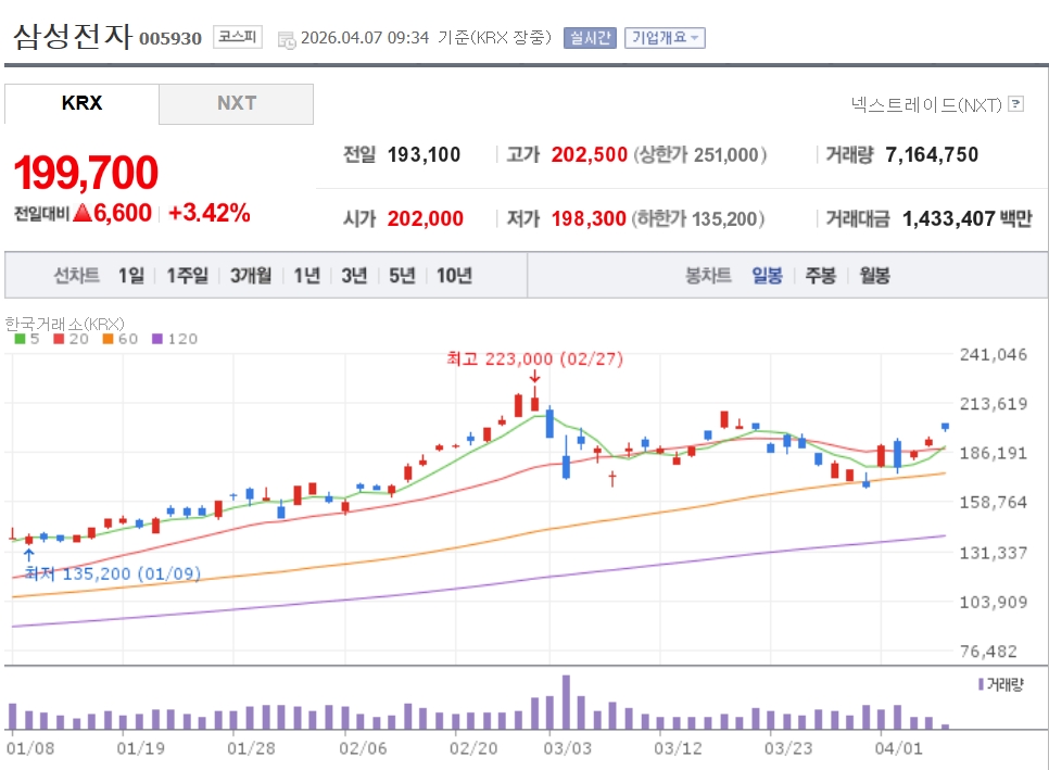 이미지 확대보기7일 한국거래소에 따르면 오전 9시34분 삼성전자는 전장대비 3.42% 상승한 19만9700원을 기록하고 있다.