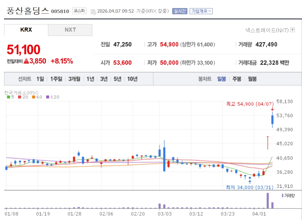이미지 확대보기7일 한국거래소에 따르면 이날 오전 9시 52분 기준 풍산홀딩스는 전 거래일 대비 8.15% 오른 5만1100원에 거래되고 있다. 장중 한때는 5만4900원까지 치솟으며 신고가를 새로 썼다.