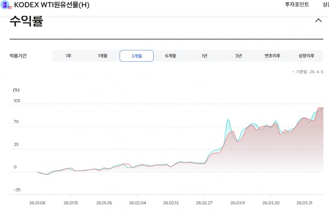 한국거래소에 따르면 7일 현재 기준, 삼성자산운용의 'KODEX WTI원유선물(H)'은 올해 초 대비 106.58%라는 수익률을 기록했다. 이는 최근 1분기 동안 원전 수출 기대감으로 독주해온 미래에셋자산운용의 'TIGER 코리아원자력'(97.82%)을 근소한 차이로 앞지른 수치다.