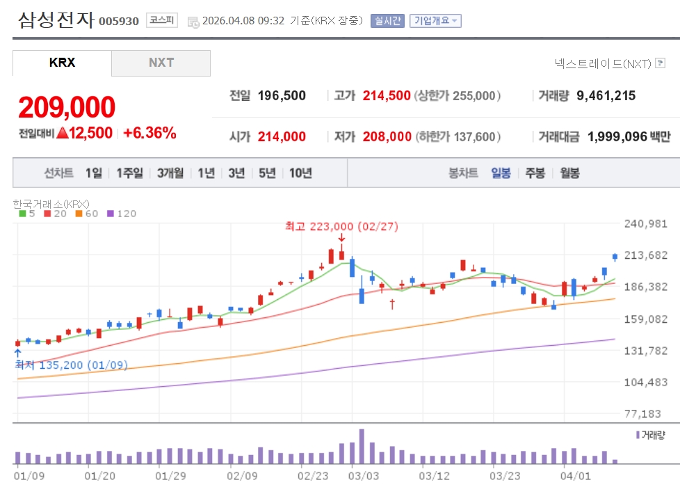 이미지 확대보기삼성전자 CI. 사진=삼성전자 삼성전자가 '20만 전자' SK하이닉스가 '100만 닉스'를 각각 회복했다. 미국과 이란이 2주간 휴전에 사실상 합의하면서 영향을 미친 것으로 보인다.