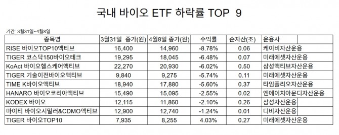 - 'RISE 바이오TOP10' -8.78% 최하위...편입 없는 'TIGER TOP10'은 4% 반등
