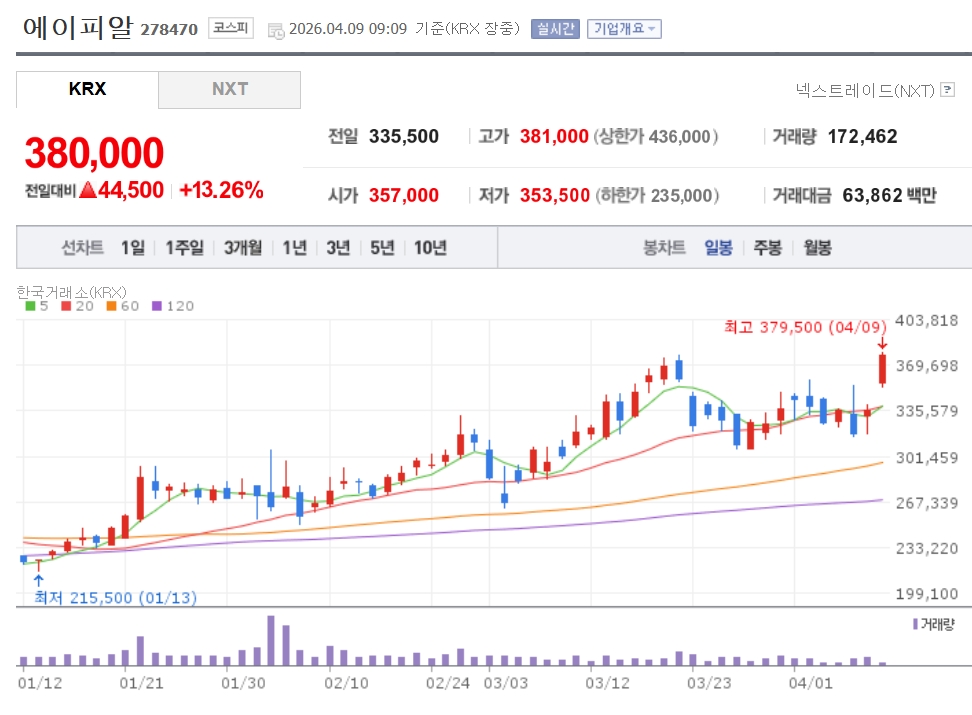 이미지 확대보기9일 한국거래소에 따르면 이날 오전 9시 9분 기준 에이피알은 전 거래일 대비 13.26% 오른 38만원에 거래되고 있다.