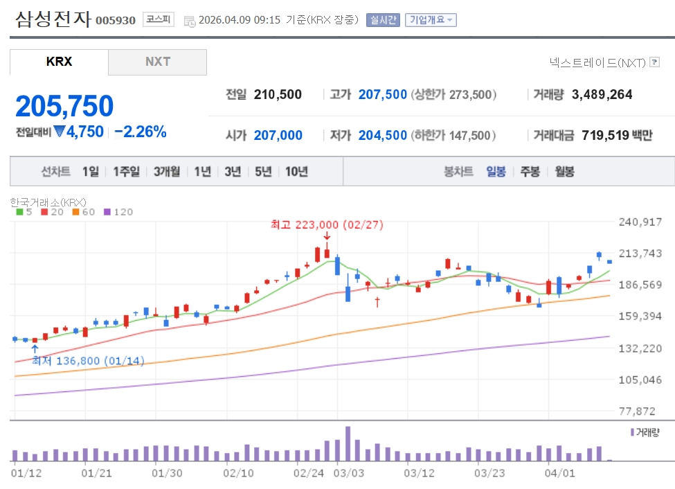 9일 한국거래소에 따르면 오전 9시15분 현재 삼성전자는 전날 대비 2.26% 내린 20만5750원에 거래되고 있다. SK하이닉스는 2.42% 내린 100만8000원을 나타내고 있다.