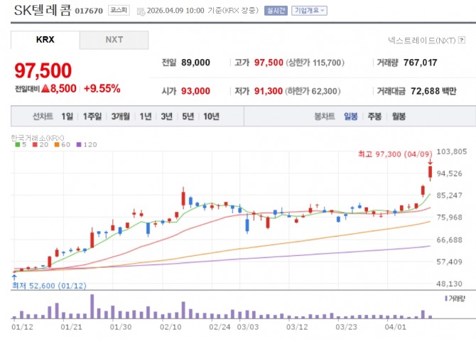 이미지 확대보기9일 한국거래소에 따르면 오전 10시00분 기준 SK텔레콤은 전 거래일 대비 9.55% 오른 9만7500원에 거래 중이다.