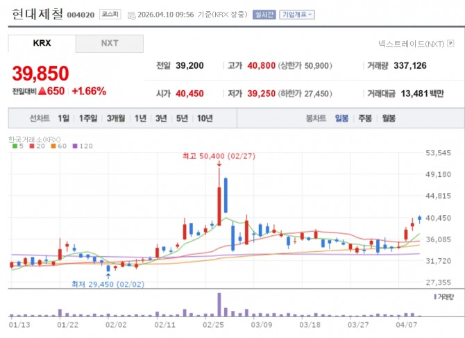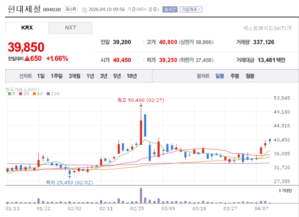 이미지 확대보기10일 한국거래소에 따르면 이날 오전 9시56분 기준 현대제철은 전일대비 1.66% 오른 3만9850원에 거래되고 있다. 고려제강은 전 거래일 대비 17.69% 오른 2만4950원에, 한국철강은 10.59% 오른 1만760원, 동국제강 7.12% 오른 1만980원, 대한제강 6.15% 오른 1만2430원에 각각 거래 중이다.