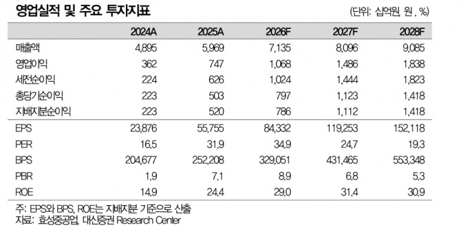 또한 “효성중공업은 2026년까지 국내 변압기 1800억원, GIS 3400억원, 미국 멤피스 2억달러(1차 증설분) 등의 증설을, 2028년까지 미국 멤피스 2억~3억(2차 증설분)을 진행 중이다”며 “2027년까지 국내 HVDC 시스템(변환기, 컨버터 제어 및 보호 시스템, 변압기, 냉각시스템 등) 5000억~6000억원 신설도 한다”고 덧붙였다.