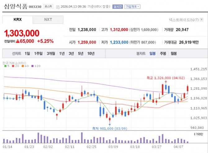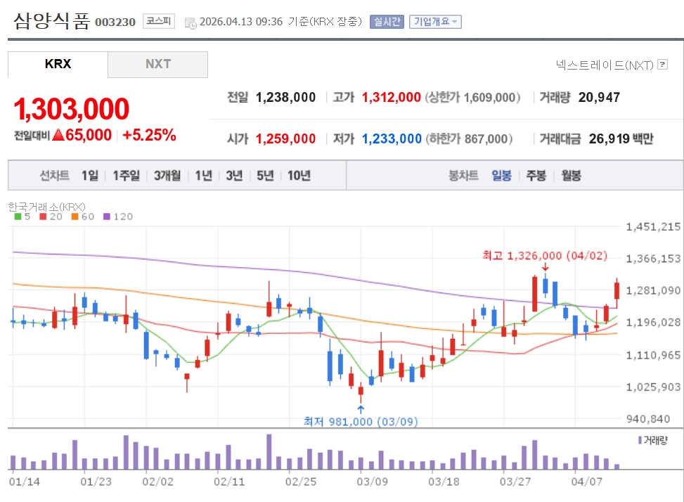 이미지 확대보기13일 한국거래소에 따르면 오전 9시 36분 현재 삼양식품은 전 거래일보다 5.25% 오른 130만 3000원에 거래되고 있다.