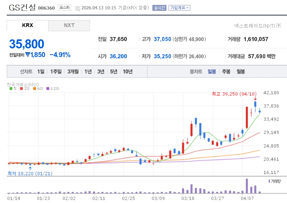 이미지 확대보기13일 한국거래소에 따르면 오전 10시 15분 현재 GS건설은 전장대비 4.91% 빠진 3만5800원을 기록중이다. 현대건설(-3.68%), 삼성물산(-1.82%) 등 다른 재건 관련 종목들도 하락 추세를 보이고 있다.