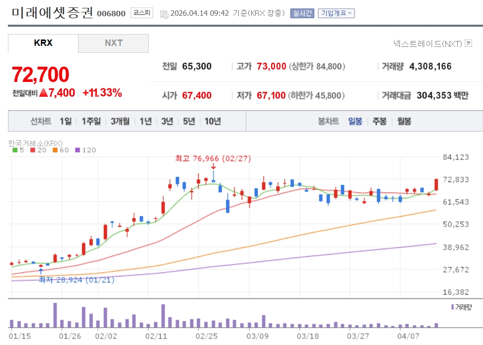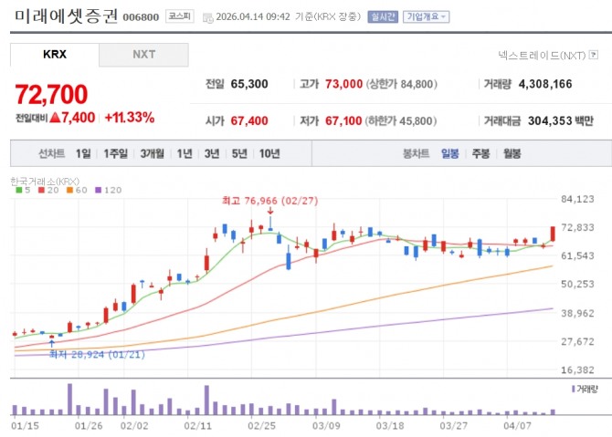 이미지 확대보기14일 한국거래소에 따르면오전 9시 42분 기준 미래에셋증권은 전장 대비 11.33% 오른 7만2700원에 거래되고 있다. 삼성증권도 전 거래일 대비 5.67% 오른 11만1900원에 거래되고 있다. 한국금융지주(3.46%), 키움증권(3.24%) 등도 상승세다.