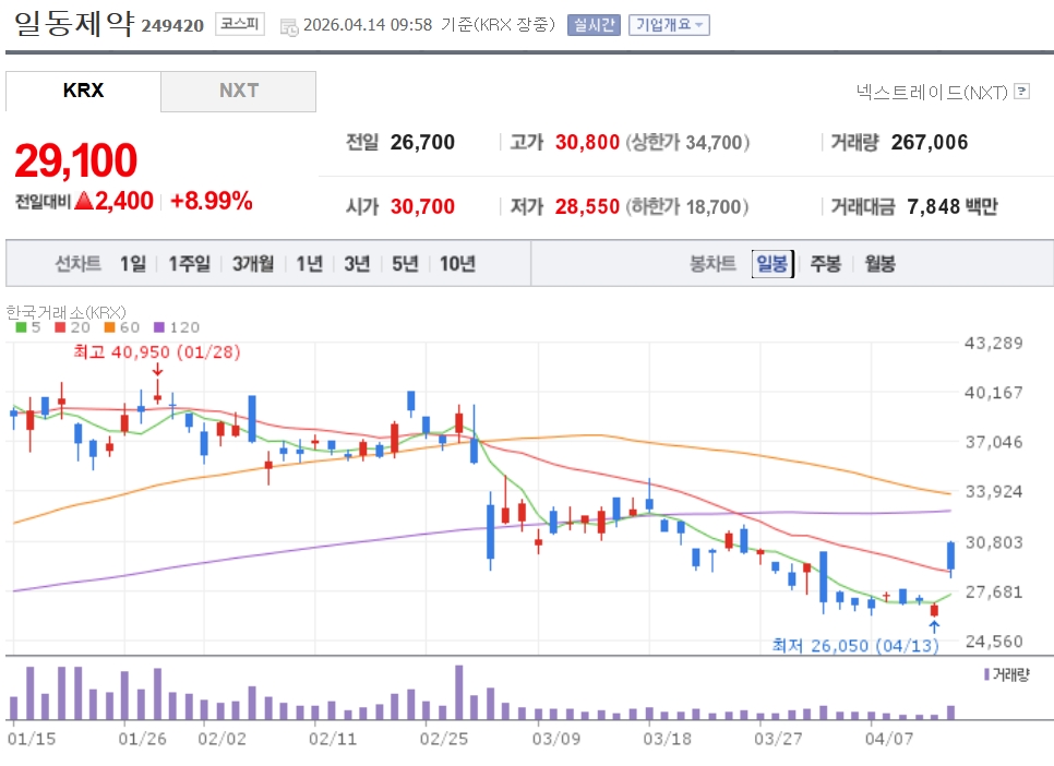 이미지 확대보기14일 한국거래소에 따르면 일동제약은 오전 9시 58분께 전날에 비해 8.99% 오른 2만9100원에 거래되고 있다.