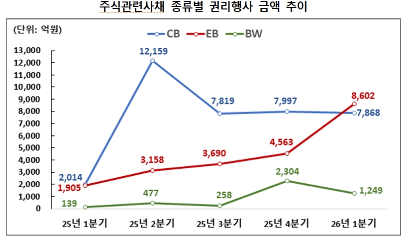 한 금융투자업계에 관계자 따르면 "1분기 행사 건수는 정체됐으나 금액이 크게 늘어난 것은 투자자들이 주가 상승기에 맞춰 대규모 물량의 권리 행사를 통해 수익 실현에 나선 결과로 풀이된다"며 "특히 교환사채의 행사 금액이 90% 가까이 급증한 점은 발행 기업의 주가 흐름이 투자자들의 기대치에 부합했음을 시사한다."고 말했다.