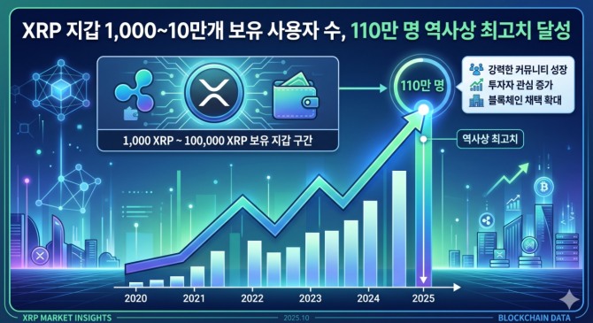 시장 분석 업체 산티먼트(Santiment)의 최신 데이터에 따르면, 1,000개에서 100,000개 사이의 XRP를 보유한 지갑 수가 110만 개를 돌파하며 역사상 가장 높은 수준에 도달했다.