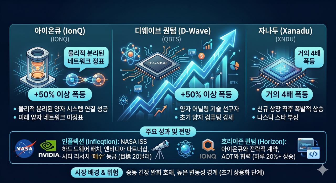 실질적인 상업적 성과와 글로벌 대기업들과의 접점도 주가 상승의 핵심 동력으로 작용했다. 양자 센서 및 중성 원자 컴퓨터 제조업체인 인플렉션(INFQ)은 이번 주 24% 상승했다. 인플렉션은 최근 미국 항공우주국(NASA)와 협력하여 국제 우주 정거장(ISS)에 최첨단 양자 하드웨어를 성공적으로 배치했다고 발표했다. 특히 인공지능(AI) 반도체 거물인 엔비디아(NVIDIA)가 가상 컨퍼런스에서 인플렉션을 주요 파트너로 언급하면서 시장의 신뢰를 더했다.
