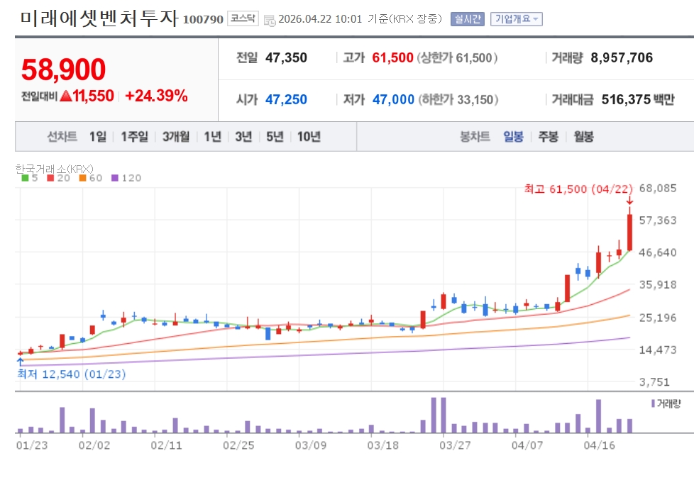 이미지 확대보기22일 한국거래소에 따르면 이날 오전 10시 1분 현재 미래에셋벤처투자는 전거래일 대비 24.39% 오른 5만8900원에 거래중이다. 아주IB투자(20.96%), 와이제이링크(12.39%) 등도 급등하고 있다.