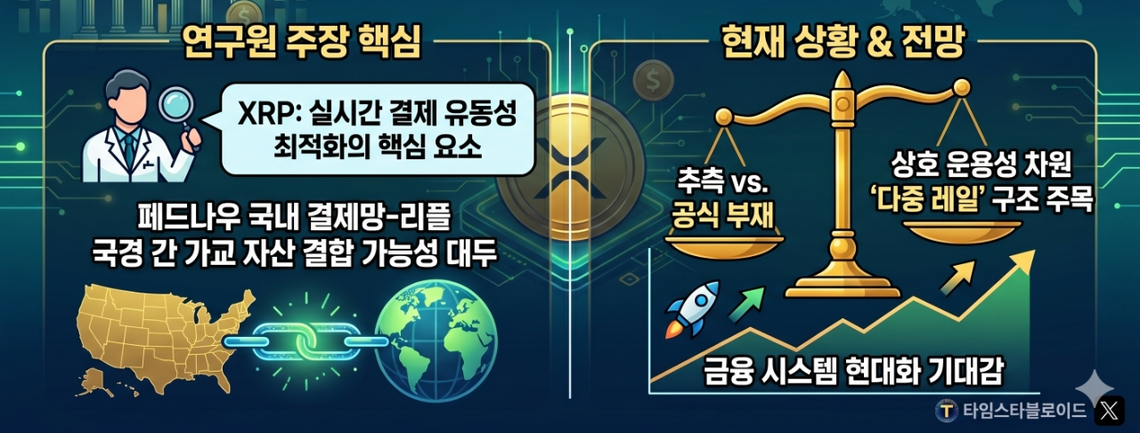 22일(현지 시각) 암호화폐 전문매체 타임스타블로이드에 따르면 최근 금융 연구원 SMQKE는 자신의 X(옛 트위터)에 "연구원이 단호하게 말합니다: 페드나우는 XRP를 사용할 것입니다"라는 제목의 글을 게시했다. 그는 XRP를 진화하는 실시간 결제 아키텍처의 필수적인 구성 요소로 제시하며, 단순한 암호화폐를 넘어 금융 인프라의 핵심 유동성 도구로 자리 잡을 것이라고 주장했다.