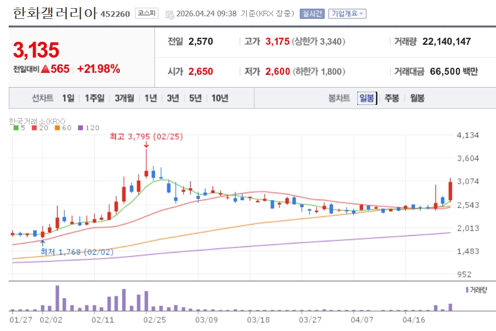 이미지 확대보기24일 한국거래소에 따르면 이날 오전 9시 38분 기준 한화갤러리아는 전 거래일 대비 21.98% 오른 3135원에 거래되고 있다. 한화갤러리아우 역시 4.13% 상승한 6800원에 거래 중이다.