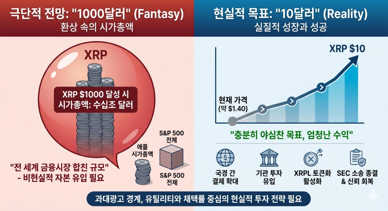2026년 4월 현재 XRP 가격은 약 1.40달러 부근에서 거래되고 있다. 전문가들은 1,000달러라는 비현실적 목표 대신 10달러를 현실적인 저항선이자 목표치로 제시하고 있다. 10달러 역시 현재 가격 대비 약 7배 이상의 수익을 의미하는 만큼, 장기 투자자들에게는 여전히 매력적인 수치다.