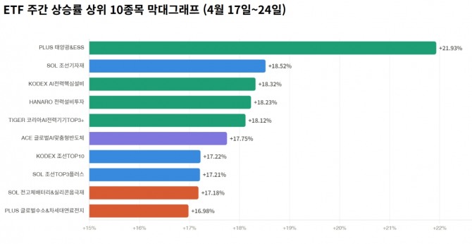 조선 테마도 강세권에 이름을 올렸다. 'SOL 조선기자재'가 18.52%로 전체 2위를 기록했으며, 'KODEX 조선TOP10'(17.22%), 'SOL 조선TOP3플러스'(17.21%) 등도 17%대 수익률로 상위권을 차지했다. AI 반도체 관련 'ACE 글로벌AI맞춤형반도체'(17.75%)와 차세대 배터리·수소 테마인 'SOL 전고체배터리&실리콘음극재'(17.18%), 'PLUS 글로벌수소&차세대연료전지'(16.98%)도 강세를 보였다.