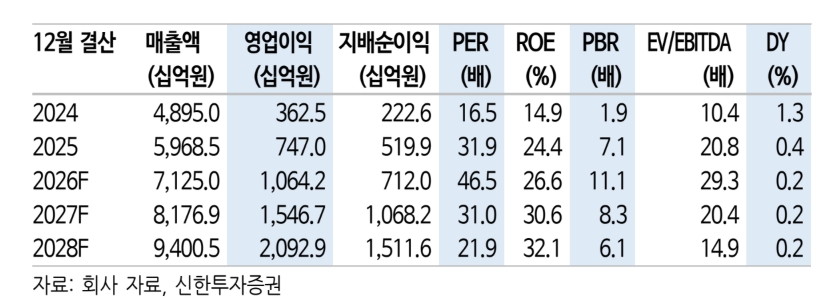 목표주가 산출은 2027년과 2028년 평균 주당순이익(EPS) 13만8334원에 목표 주가수익비율(P/E) 28.56배를 적용했다. 국내 전력기기 3사의 2022년~2024년 평균 P/E에 80%를 할증한 수치다.