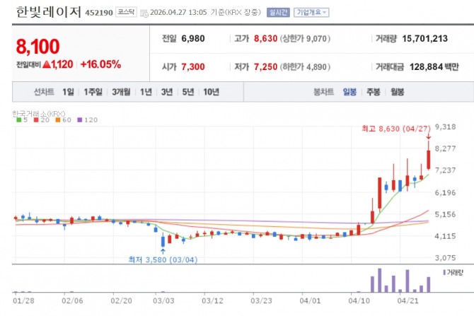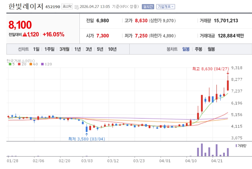 이미지 확대보기27일 한국거래소에 따르면 한빛레이저는 오후 13시05분 전장대비 16.05% 오른 8100원을 기록 중이다. 이날 8630원을 터치하며 최고가를 기록했다.