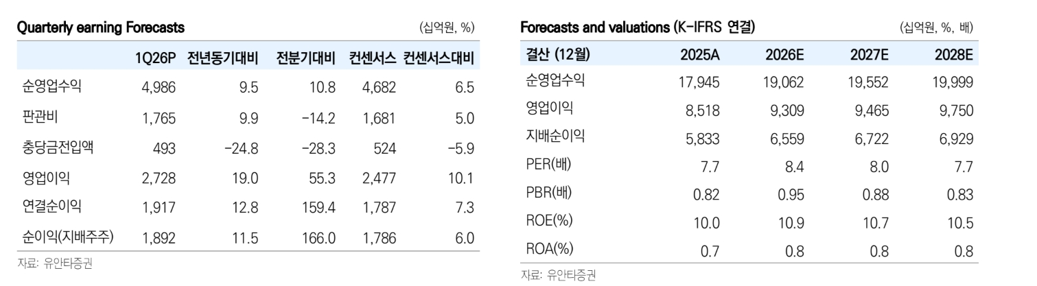 또한 "2분기 CET1 비율이 최소 13.71%까지 오를 것"이라며 "당기순이익 효과가 50.6bp 상승 요인으로 작용하는 가운데 위험가중자산(RWA) 증가와 배당·자사주 영향을 반영해도 8bp가량 개선될 수 있다"고 부연했다.