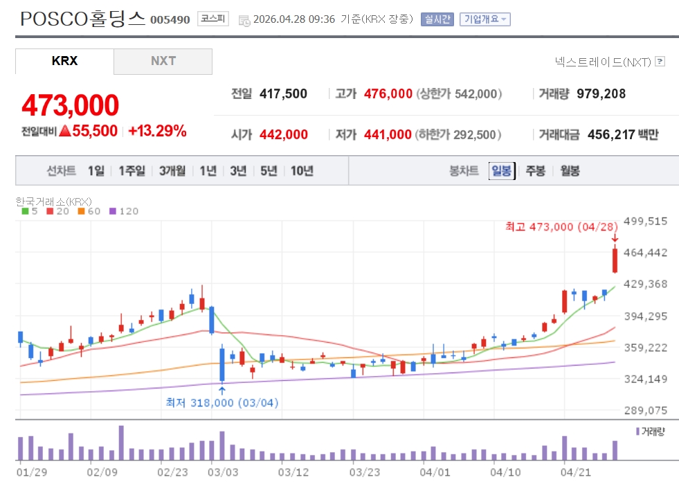 이미지 확대보기28일 한국거래소에 따르면 이날 9시 36분 현재 POSCO홀딩스는 전일대비 13.29% 오른 47만3000원을 기록 중이다. 포스코스틸리온(26.03%), 현대제철(4.13%), 동국씨엠(5.52%). 고려제강(1.98%), KG스틸(2.76%), 동국제강(3.24%) 등이 각각 강세다.