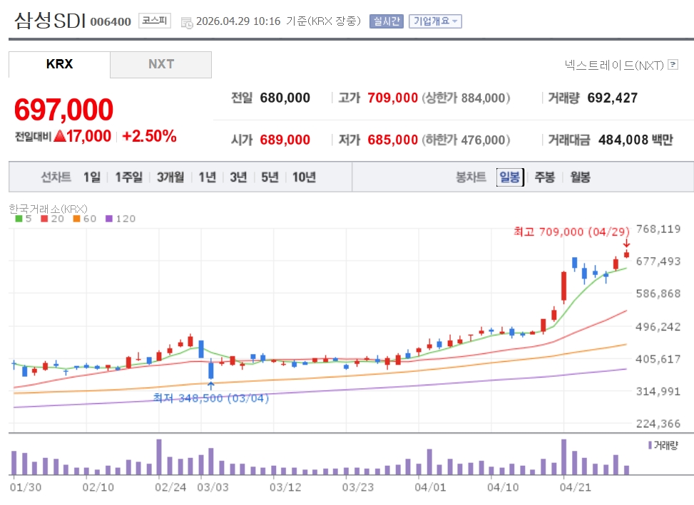 이미지 확대보기15일 한국거래소에 따르면 오전 10시 16분 현재 삼성SDI는 전 거래일보다 2.50% 상승한 69만7000원에 거래되고 있다. 장중 최고가인 70만9000원을 터치했다.