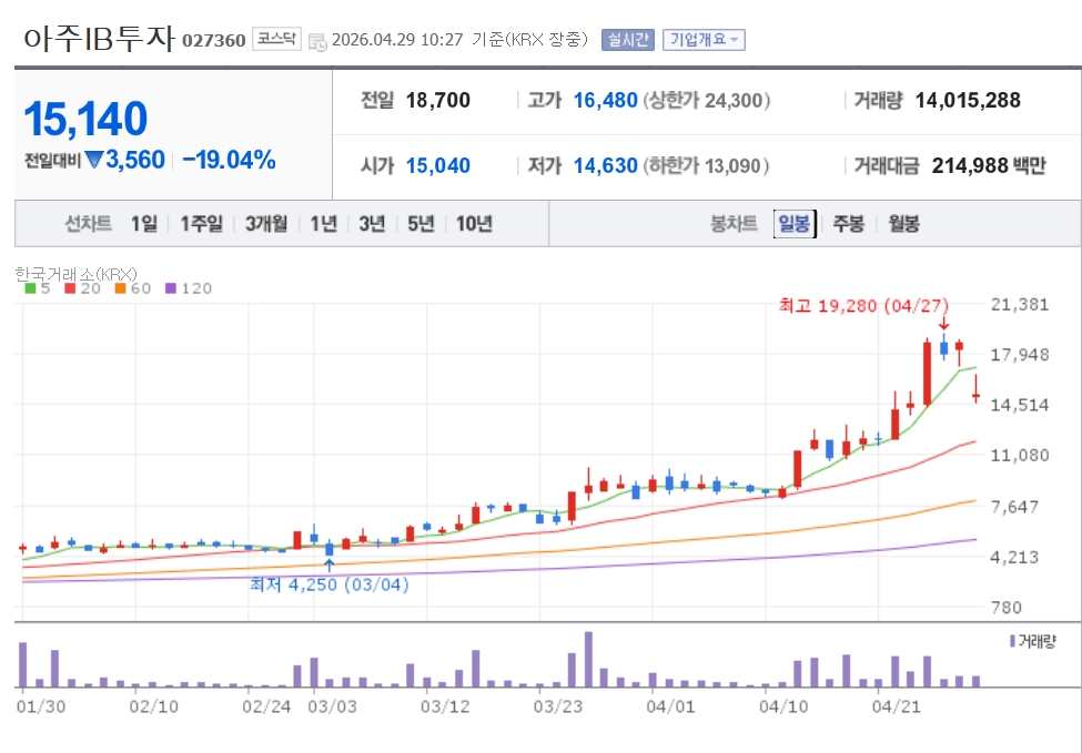 아주IB투자 주가 추이. 자료=네이버페이 증권이미지 확대보기
