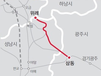 이미지 확대보기위례삼동선은 위례신사선을 성남시 원도심과 성남하이테크밸리를 거쳐 광주시 삼동역까지 10.6km 연장하는 광역철도 사업이다.
