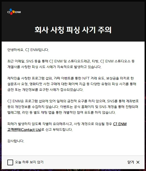 CJ ENM, “회사 사칭 피싱 사기, 주의하세요”