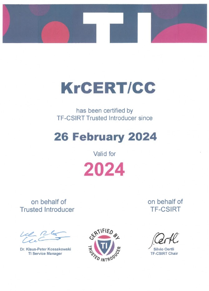 한국인터넷진흥원(KISA)은 지난 2월 유럽 보안 인증제(TI, Trusted Introducer)의 최고 등급인 '인증(Certified)' 단계를 유럽 외 국가 최초로 획득했다고 6일 밝혔다.