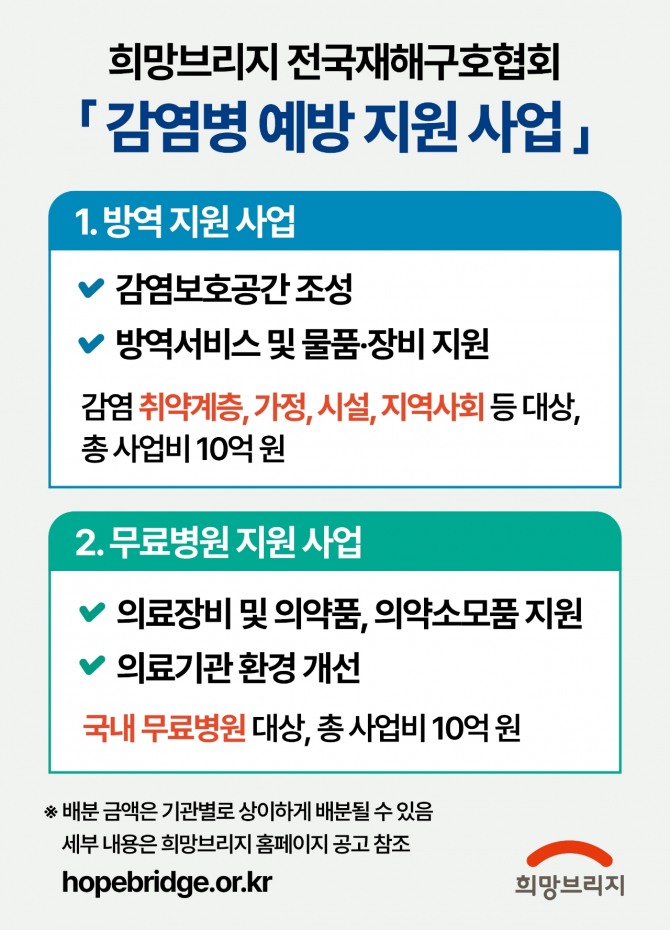 의료사각지대 감염병 예방을 위한 무료병원지원사업은 취약계층에 신속하고 양질의 의료 서비스 지원을 통해 감염병 확산 예방 및 사회안전망 강화에 기여하기 위해 추진한다. 지원 분야는 △감염병 치료 및 예방을 위한 의료 장비 및 의약품, 의약 소모품 지원 △안전한 의료 서비스 제공을 위한 의료기관 환경 개선이다.