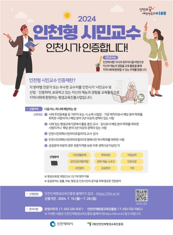 시민 교수 활동을 위한 지원자는 인천에 주민등록을 두거나 시 소재 사업장 및 기관 재직자 등 일정 요건을 충족해야 한다. 이달 15일부터 28일까지 인천인재평생교육진흥원 홈페이지와 ‘다모아정보망’을 통해 신청서를 제출하면 된다.
