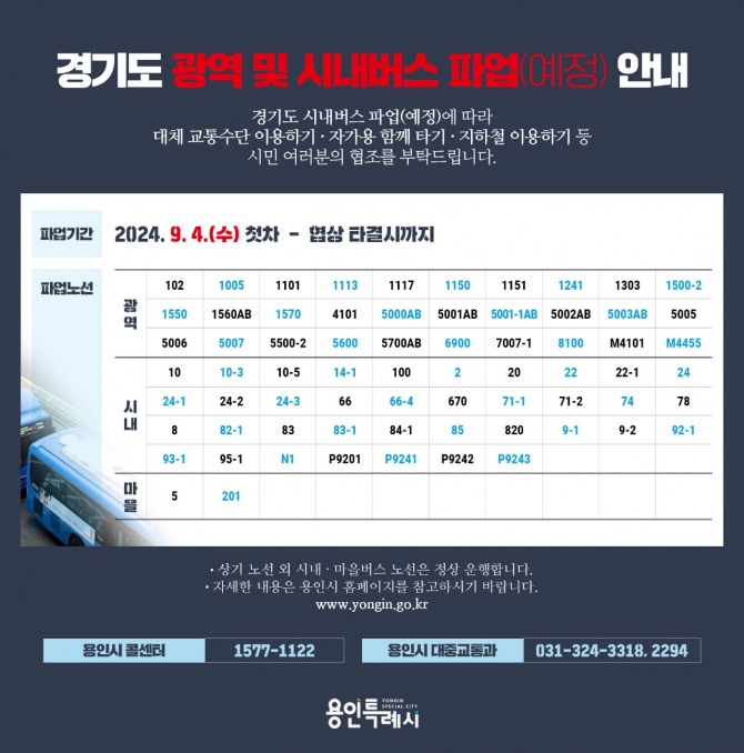 이상일 용인특례시장은 “경기도버스노동조합협의회의 파업 예고에 따라 시민 불편을 최소화하기 위해 긴급하게 전세버스 투입 등의 대책을 마련했다”며 “시민들은 용인시 홈페이지나 TV 등 언론매체에 귀를 기울여 일상생활에 혼란이 없도록 하고, 자가용 함께 타기나 지하철, 경전철과 같은 대체 교통수단 이용 등에 적극 협조해달라”고 당부했다.