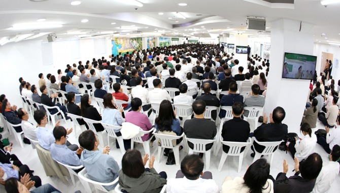 3일 경기 수원시 장안구 신천지 수원교회에서 열린 ‘신천지 요한지파 말씀 대성회’에 참석자들이 강의를 듣고 있다. 사진=신천지 요한지파