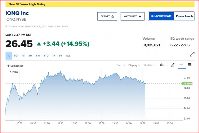 이미지 확대보기14일 뉴욕증시에 따르면 아이온큐 주가는 트럼프 당선인이 양자컴퓨팅을 집중육성할 것이라는 기대에 급등했다. 아이온큐는 앞서 예상밖 매출 증가라는 실적발표 결과가 나오면서 한차례 주가가 급등한 바있다. 드디어 양자컴퓨팅에 봄이 오는 것인가 하는 기대가 아이온큐와 양자컴퓨팅관련 종목의 주가 급등을 몰고 왔던 것이다.